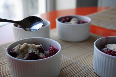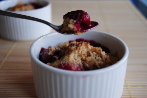 2. Przełóż owoce do 4 małych miseczek i posyp kruszonką. Piecz je w piekarniku nagrzanym do 220 stopni przez 15 minut.