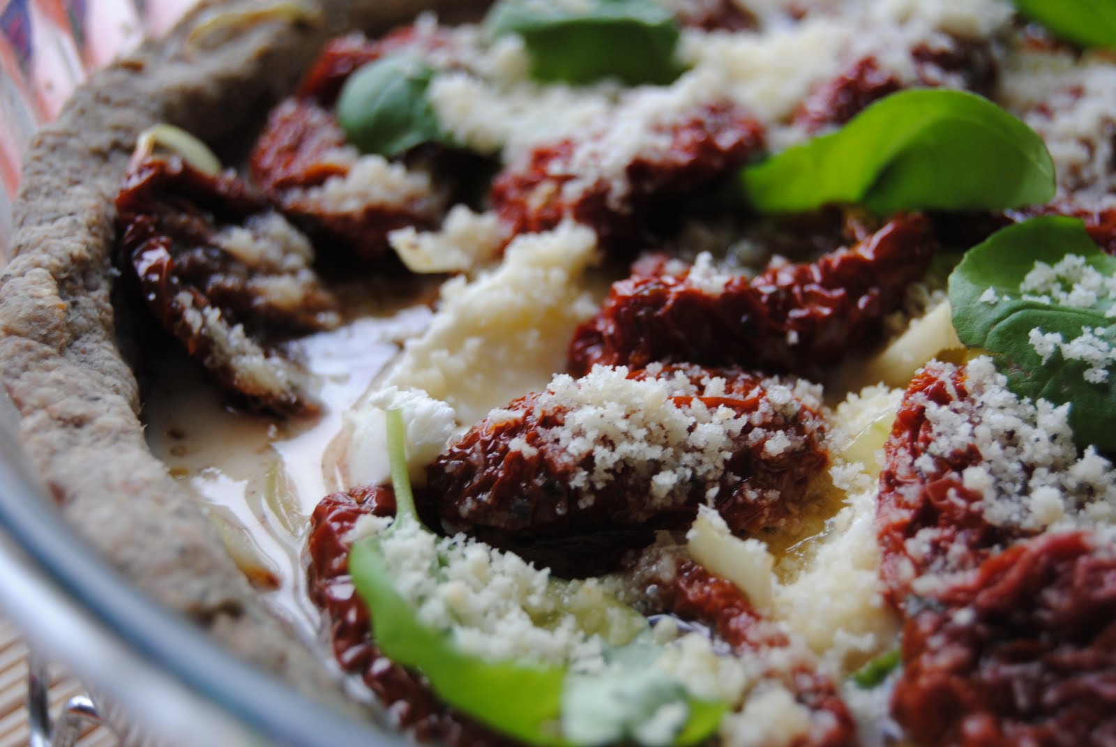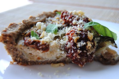 Dzień urlopu uczciłam w najlepszy z możliwych sposobów – decydując się na pieczenie eksperymentalne. Musiałam sobie najpierw powtórzyć kilka razy, że jak się nie uda, to nic złego się nie stanie, że nie tracę czasu i że mam prawo po prostu się poobijać, nawet jeśli efekt będzie koszmarny. Potem zaczęłam się martwić, że zmarnuję te pyszne suszone pomidory, ale uznałam, że jakby co, to można je potajemnie wyciagnąć z tarty i zjeść na pocieszenie zanim ktokolwiek zobaczy. Tym sposobem zaczęłam robić tartę na razowym cieście czosnkowym..
